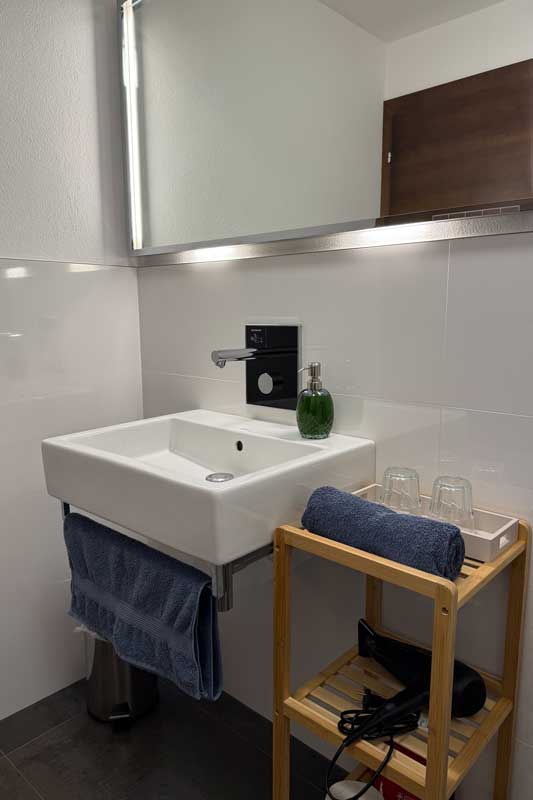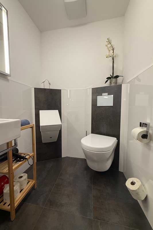 Der separate Sanitärbereich bietet Ihnen einen modernen Waschtisch mit berührungsloser Armatur, ein WC und ein Pissoir. Ein großzügiger, beleuchteter Spiegel ergänzt das Badezimmer.