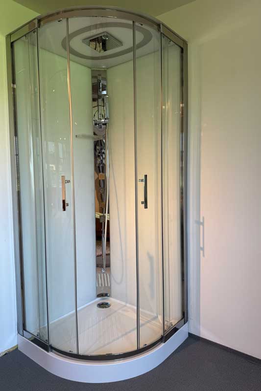 Die moderne Dusche ist das Herzstück dieses kleinen Entspannungsbereichs und bietet Hand-, Kopf- und Seitenbrausen für ein angenehmes Duscherlebnis. Ein Handtuchheizkörper, der auch als Spiegel fungiert, ergänzt die praktische Ausstattung. Das gemütliche Sofa lädt zum Entspannen ein und schafft eine einladende Atmosphäre, in der man die Ruhe genießen kann.